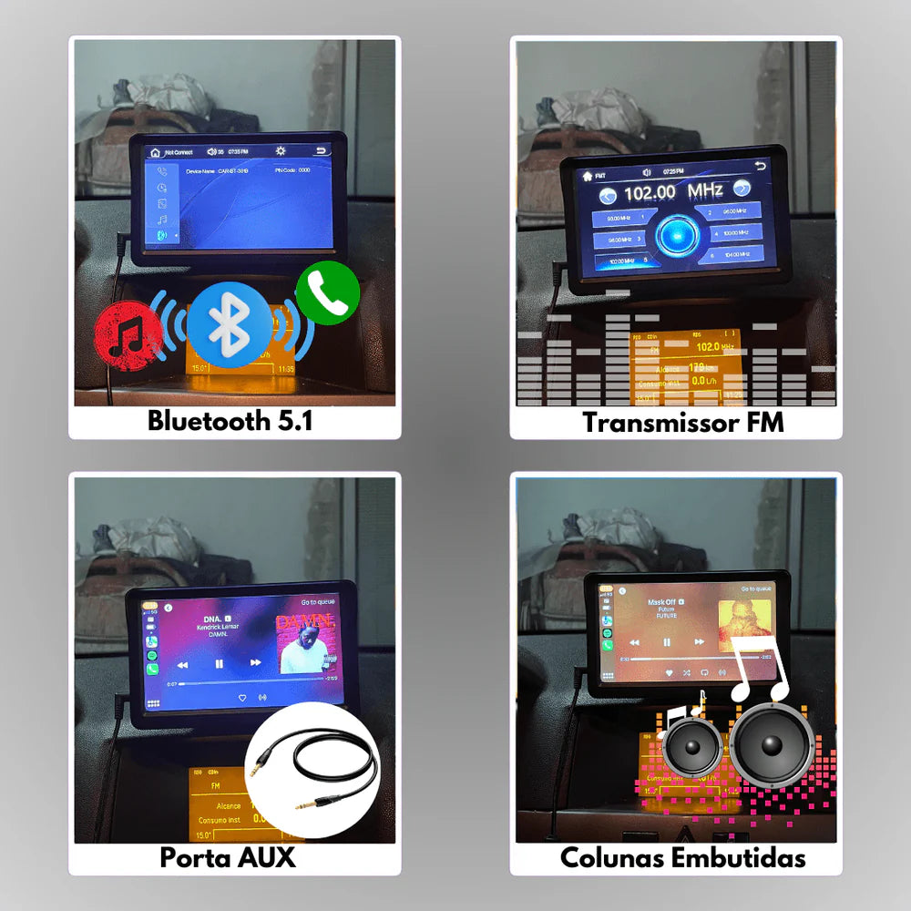 - Transmissor FM: Basta sintonizar na frequência indicada na multímidia e o som sairá nas caixas do carro (sem fio!)